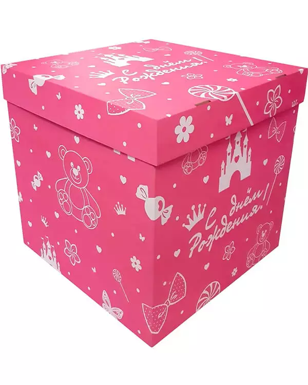 Внутри коробки можно разместить воздушные шарики различной формы, записку с пожеланиями или подарок.